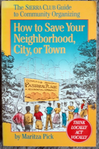 How to Save Your Neighbourhood, City or Town – Maritza Pick – Sierra Club Books (US) 1993 ISBN 0 87156 522 6 – The book is divided into two parts. The first part covers organising the community to solve environmental problems including how to begin, leadership and teamwork, generating a newsletter, pitfalls and rewards of political organising and the public hearing process (US only). The second part covers how to win environmental campaigns and elect environmentalists to public office which talks about the campaign committee, fundraising, the media, volunteers and the end point: victory or defeat.
