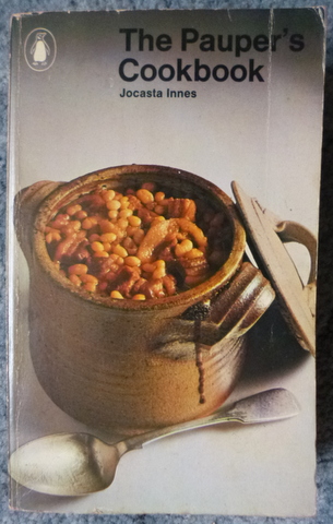 The Pauper’s Cookbook – Jocasta Innes – Penguin Books (UK) 1971 ISBN 9780711235618 (was re-issued recently). The book has over 250 recipes covering the standard stuff, leftovers, quick dishes based on pantry stuff, money saving extras and living off the land, special occasion dishes and dieting on the cheap. There are also sections on menu planning and kitchen equipment. Recipes are a bit out of date (liver kebabs???????).