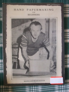 Hand Papermaking for Beginners – Kayes Van Bodegraven – The Mould and Deckle (AUS) 1981 ISBN 0 908066 00 7 – Based on the use of wastepaper this book provides excellent coverage of basic papermaking with very large black and white photos of each step. There is very little DIY equipment making. The book has good detail on slecting fibres and making the pulp and a small amount on embossing, watermarks and envelopes.