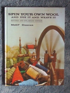 Spin Your Own Wool – Molly Duncan – A. H. & A. W. Reed (AUS) 1972 ISBN 0 589 00334 8 – This is a thin little book of only 50 pages but has lots of line drawings, black and white photos and information. There are sections on spinning with a wheel and spindle, plying and skeining, choosing your wheel, scouring bleaching and dyeing as well. There is also an intro to hand weaving!
