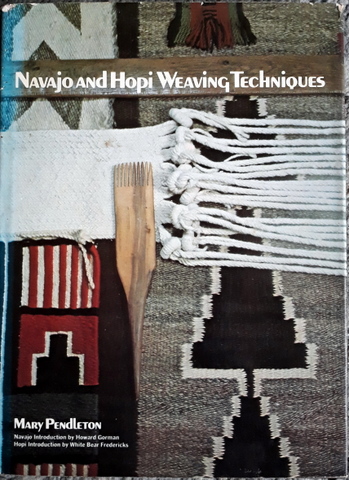 Navajo and Hopi Weaving Techniques – Mary Pendleton Macmillan Publishing Co Ltd. (US) 1974 ISBN 0 02 595500 4 – This is really two books in one – Navajo Techniques (pp 9 – 98) and Hopi techniques (pp99 – 157). Navajo techniques: Chapter one covers how to make a Navajo loom, tools and warping frame; Chapter two talks about yarns to use for warp and weft, twinning and Navajo selvage threads. Chapter three talks about preparing the yarn, carding, spinning, plying and dyeing and Chapter four is a page on design, chapter five is about selecting the technique and chapter six is about selecting yarns. Chapter seven is about mounting the warp, chapter eight is about things you should know before weaving and chapter nine covers beginning the weaving. Hopi Techniques: this book is along similar lines and coverage to the previous book but goes deeper into design, winding the warp and weft tension. Both books have B&W photos and some line drawings and there are a series of colour plates between the two books.