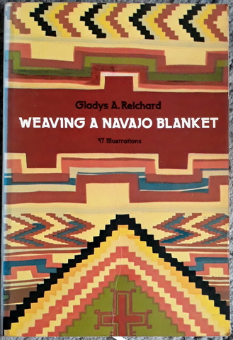 Weaving a Navajo Blanket – Gladys A. Reichard – Dover Publications Inc. (US) 1978 ISBN 0 486 22992 0 – This book follows the usual pattern, starting with the weaver, wool and how it is prepared for weaving, deciding on the yarn colour and how to make natural dyes, weaving implements and setting up the loom, how to weave and using a pattern. The book then focusses on ‘saddle blanket patterns’ and how to weave them. Warp weaving, used by the Navajo to make belts, sashes, garters and headbands is discussed. Also covered are sandpainting tapestries, how to tell the origin and age of a Navajo blanket, their symbolism and how to buy one. The book doesn’t have a lot of illustrations for its size but there are some B&W photos and line drawings.