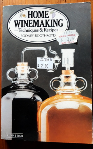 Home Winemaking Techniques & Recipes – Rodney Boothroyd – Allison & Ashby (UK) 1985 ISBN 0 85031 622 7 – The book is divided into three parts, but part one consumes most of the book. Part one (Winemaking at home) covers the basics of winemaking including extracting the flavour, fermentation and maturation; basic equipment required; fermentation jar and air lock; hygiene and sterilisation; winemaking techniques; selecting the ingredient and extracting the flavour. This is followed by looking at yeast and yeast nutrient; the process of fermentation, producing stronger wines and use of the hydrometer; when fermentation is complete; racking and the finished wine; fortifying wine; blending wines; storage maturation and bottling. A section on problems, faults and remedies completes the section. Part two provides 120 winemaking recipes and Part three covers making sherry and sparkling wines. There are a few line drawings scattered throughout the book.