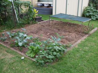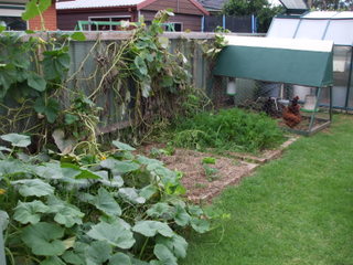 This is a moveable A-frame chook shed that has no bottom so when it is moved onto a newly harvested veggie bed they go berserk, wreaking havoc on the remaining pests (like snails) and weeds or past their prime veggies that remain in the plot. The tractor has the same footprint as most of the veggie beds. The chooks do enjoy their job, particularly when getting onto anew plot, they rip the living daylights out of it and reduce it to a desert (albeit a fertile one) by scratching up and digging in the remaining vegetation as well as manuring it. They spend two weeks on each plot and when they have finished it just remains to remove any root systems still in place, smooth out the surface, apply the mulch and replant when the seedlings become available. So they do all the hard work and on top of it all produce eggs, it works for me. We have had up to half a dozen chooks in the tractor but at the moment we have two Rhode Island reds and one Australorp, but we are currently breeding up some replacement layers.