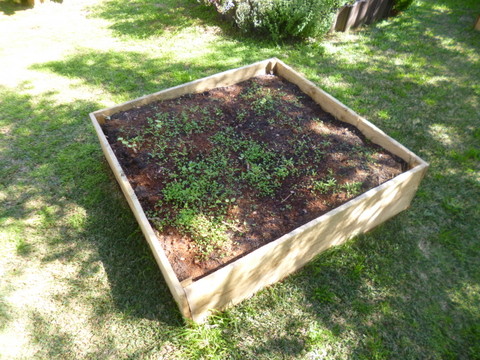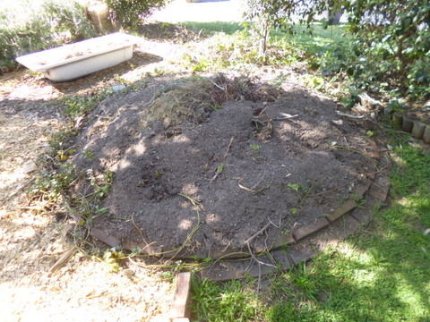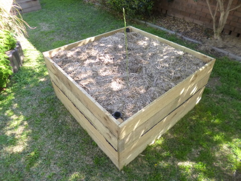 A friend of mine put one of these together and found it worked very well and I had a bit of spare space north of the (then) banana circle so I put one together late last year. It gave me a reasonable crop of tomatoes, capsicums and butternut pumpkins, even though it got planted out a bit late in the summer to grow really well. It has been left fallow over winter and I just recently topped it up with growing medium. So I am reprising its use this year and it currently has a few butternut pumpkin seedlings and some insectary plants. I will put a few more bits and pieces in before too much longer. If you want more construction details they are available here.