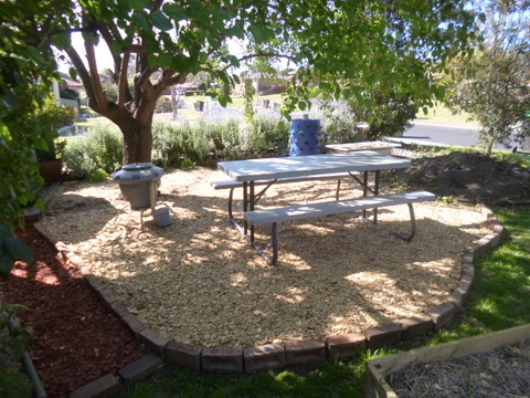 The mulberry tree is also still in place. Although, while it had basically scrappy grass and bare earth underneath it before, we have now revamped the area into a more pleasant parklike environment. There are wood chips covering the area underneath with curved brick edging which not only tidies the area up considerably but reduces the area which I have to mow. There is a table and bench set up where we can eat, read or just sit and enjoy the garden. There are also plans in the wind to install a swing on one of the larger horizontal branches for our grandson.