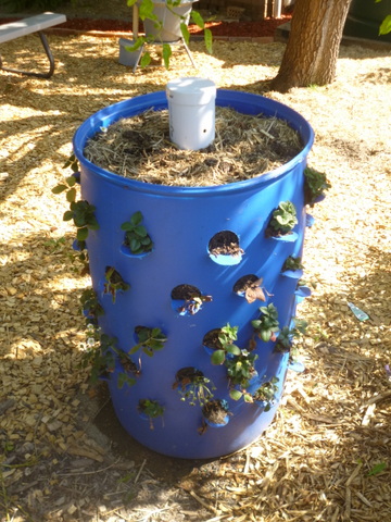 Another recent addition. I got hold of a blue plastic drum and cut a series of holes in the side, filled the drum with growing medium (and a central pipe for an internal worm tower) and then planted it out to strawberry plants. It is situation in the area near the mulberry tree but is far enough out that it gets full sun most of the day. As with most things the results have been variable. Some plants have passed on to the great veggie patch in the sky while others are doing very well and starting to produce. If you want more construction details they are available here.