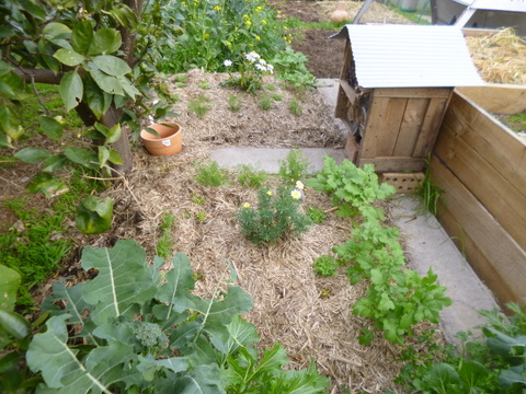 There have been no outrageous changes to the retirement village with the exception that we now grow a choko vine over it each summer to keep it cooler and also provide more chokos. Also a surplus internal door has been placed of the west facing mesh to reduce the summer heat on the retired chooks. The worm shed has not changed much either, and is still in operation as it was four years ago. This year I am hoping to progress the mushroom growing area and I am planning to use the flat roof of both the retirement village and the worm shed to install a green roof. That is the plan, we will see how it develops in practice. to the right of it is the Jerusalem artichoke bed, which continues to provide food for us during late autumn and winter.