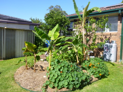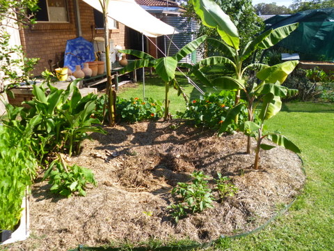 As mentioned previously the banana circle has been relocated to the back yard. It was never a success in the front yard due to too much shade, poor soil and lack of water. The new area is in full sun, the soil has been built up with compost and other organic materials to form the mound and there is access to 2 sources of greywater. I hold out great hopes and see plenty of bananas in our future!