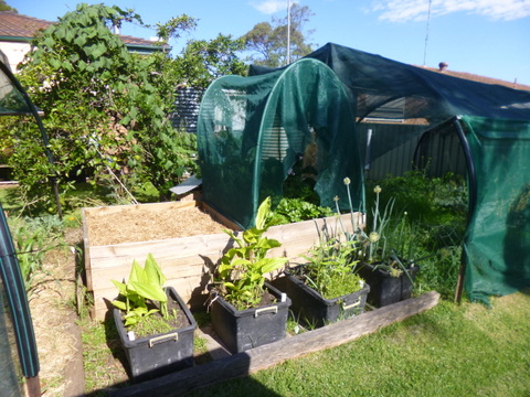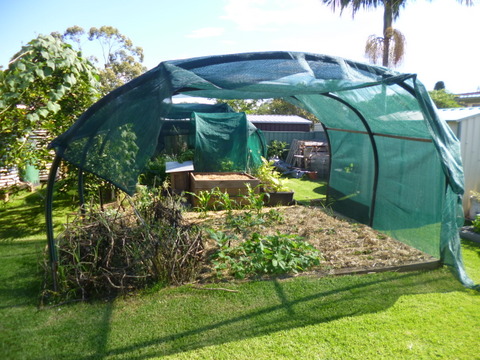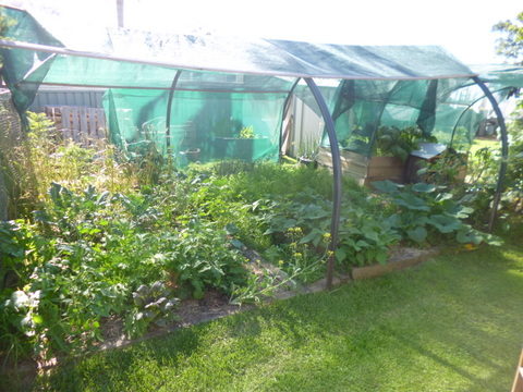 The western Sydney summer sun is not getting any more forgiving and in fact may be getting harsher, so a couple of years ago I bit the bullet and put sunshades over the central veggie beds which comprise the greater part of our growing area. I hammered in some star posts, then slid loops of 50mm irrigation pipe over the top, connected the loops with some timbers and then covered the lot with 50% shade cloth. It works a treat, still allowing the plants to grow on those hot summer afternoons and reducing the amount of water we need apply. The four beds along the back fence are on the plant to receive a similar covering this year.