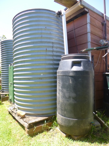 There are three tanks in the back yard, two galvanised tall form 2500 litre tanks behind the garage and one 500 litre plastic tank that is connected to the shed on the north side of the house. There have been no meaningful changes to water storage tanks except the addition of a 200 litre black plastic drum being added to the outflow of the tanks behind the garage.