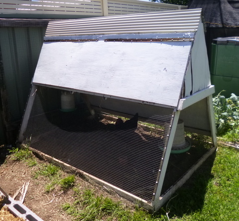 The chook tractor is still in operation although it is now on its third iteration. The dark green paint on the previous one, while it looked quite fetching, meant that it heated up too much in summer. Also, because the bottom part was mesh all the way round it meant that the chooks got baked by the afternoon summer sun due to lack of shade. So to fix these problems the tractor is now painted a nice reflective gloss white and one long side goes down almost to the ground so that the chooks get shade from the afternoon sun. I think that this is the best of the three designs and if I were to have to rebuild it from scratch, this is the design I would use.