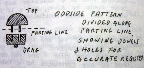 Some oddides are split along the “parting line” into not necessarily symmetrical halves. The parting line is simply that plane cut through a pattern which gives an equal contour or slope above and below.