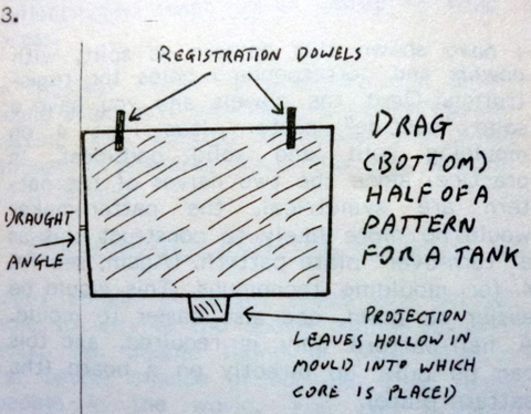 I have shown as split with dowels and corresponding holes for registration. Omit the dowels and you have a solid ‘oddside’ pattern (see part 4 on moulding split and solid oddsides). In practice, since the two halves of the pattern are symmetrical, the patternmaker would be more likely to construct this as a ‘turn-over’ plate pattern (again, see part 4 for moulding techniques. This would be easier to build, and easier to mould. A half-pattern only is required, and this can be built up directly on a board (the pattern plate).