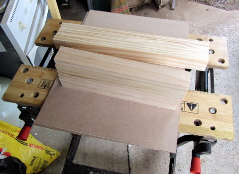 2. The second thing was to cut out the framework from the 42mm 19mm pine. This required us to cut two pieces 450mm long, three pieces 310mm long and one piece 160mm long. When I was at Angie and Deniz’s place we used the portable circular saw and a makeshift bench constructed from a multi-folding ladder, which is nowhere near as clumsy and dangerous as it sounds! When I made our at home I just used my drop saw (boooring!).