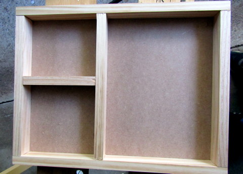 5. The dividers were next. We did this with the tray right side up, and placed the third 310mm piece of pine into the tray and located it 160mm from what would be the left hand side of the tray. We put the pine into place and marked where it fit with a pencil, applied the glue to the edge and replaced is as marked it then secured it with a screw (pre-drilled) into each end.