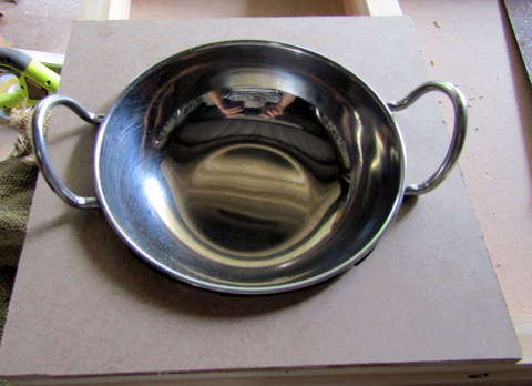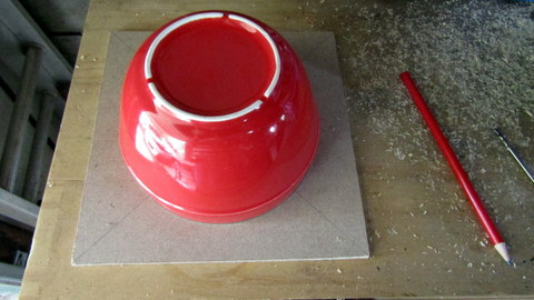 To set out the bowl support we found a bowl slightly smaller in diameter than the ‘official’ bowl to use to mark things out. (They did not have a compass in the house to allow me to draw a circle in pencil). WE drew cross lines diagonally from corner to corner with a pencil, then use the cross to locate the upturned bowl in the centre of the support board by eye, then traced a line around the outside of the bowl to form out cut line. We used a jigsaw to cut out the central hole by drilling a 10mm hole close to the traced line, inserting the jigsaw blade, then cutting around the line to remove a circle from the centre of the MDF.