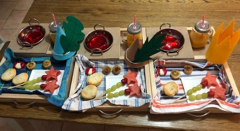 (trays included a hat, Gaston Babybel cheese ladybugs, mini pies and quiche, fruit wands, orange juice and magic jelly)