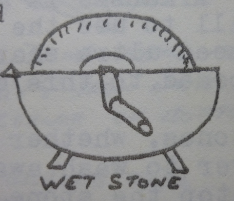 The wetstone is so named because the wheel is partially immersed in water. The water is carried around the wheel as it is slowly turned. The water serves to keep the steel cool and to wash away particles of steel that would otherwise clog the stone. The cutting action is much slower than an emery wheel, which is a major reason for wetstones losing popularity.