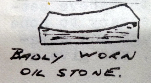 NOTE: I’ve purchased badly worn stones in second hand shops for nominal prices. They can be refaced using a bucket of sharp sand and a hard flat surface. Put some of the sand on a hard flat surface such as a piece of marble, a big quarry tile, or a piece of glass. Wet the sand with water and rub the stone back and forth to abrade away the high spots. Keep plenty of water and sand on the surface to speed the cutting. Also, turn the stone end about frequently, and keep shifting the stone to different parts of the surface so that it will remain flat and true.