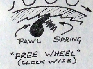 I have elected to include the freewheeling device under the “Drive Mechanics” section simply because it is located inside the rear wheel sprockets. Basically, the freewheeling mechanism is a set of (usually) two pawls inside the rear wheel cluster. It gives very little trouble and lasts for a very long time. However it does need maintenance from time to time. It can only be worked on with the rear wheel removed. If you stud the gear cluster you will notice that there is an inner ring screwed into the gear periphery. There are two holes in the inner ring, and I guess there is a special spanner to suit, though I haven’t found one as yet. The ring is hardened so I use a 2 inch wire nail as the punch (nails are very soft steel). With the nail in one hole then laid over to an angle of 45 degrees, one blow from a hammer is usually sufficient to loosen the ring. The important thing is to determine which way the thread ruins before you start. Normally it is a right hand thread (clockwise tightening) so you point the nail anticlockwise. If in doubt, get a fine nail, pin, probe or wire and run it in the thread. You can readily determine which way it tightens and loosens. I have found that an old dental pick is most useful for this purpose.