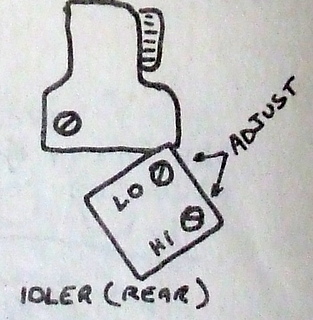 Moving the rear hub selector lever causes the trailing idler arm to move laterally. It must move from the inner gear to the outer, without any extra movement to either side. The limits of this movement set by tow small screws on the idler arm. I’d suggest you don’t tamper with the gears unless the chain is jumping off either sprocket. If the chain shows a tendency to jump off while pedalling, then take the following measures – Raise the rear of the bike so the wheel is clear of the ground. Select the highest gear by the lever, then while standing at the rear of the bike, sight the idler wheels to make sure that they are in a vertical line with the chain sprocket. If this is not the case, slowly turn the screw marked “H” until the idler pulleys and the sprocket line up vertically. Then crank the pedal while changing gears to the lowest gear. If the line-up is not perfect, adjust the “L” screw until it is. (Usually there is very little screw adjustment required – maybe ½ to 2 turns maximum.) Usually that is all that is required.