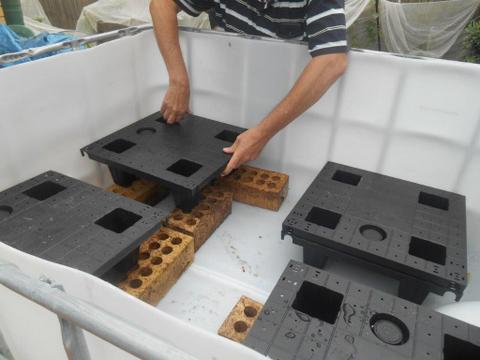 We screwed the pieces of Perspex onto the top of the ‘water ups’ to form a shelf on each side of the IBC, leaving a trough in the middle, there was no vermiculate placed in the wicking area of the ‘water ups’. To get the wicking bed to…..wick, we put the shade cloth over the shelves inside the IBC then folded it down into the trough between the two shelves, so that the growing medium would be always in contact with the water in the reservoir, right down to the bottom. We then filled the wicking beds/IBCs with the growing medium and the job was finished!