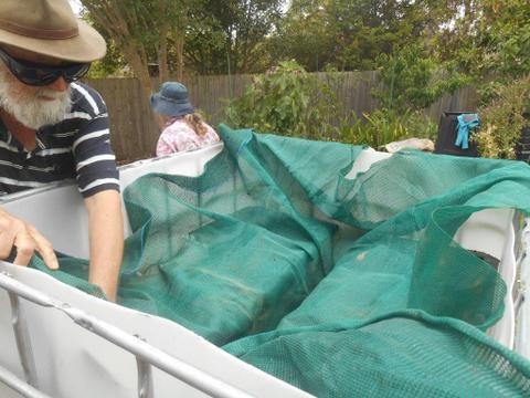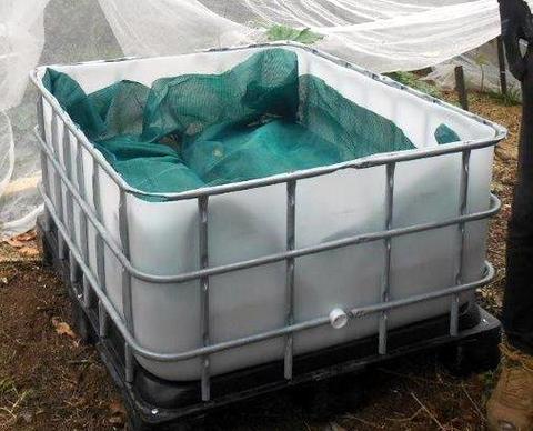 The plastic cube of the IBCs had already been cut in half, as was the surrounding cage to allow a support for the sides. Into the bottom of the cut off IBC we were to place a number of ‘Water Ups’ with the wicking area filled with vermiculite or perlite, and then a layer of shade cloth placed over the top. The growing medium would then be shovelled in on top of the shade cloth. She had already installed a small pipe in the side of the wicking bed at the level of where the top of the ‘water up’ would be, to be used as a fill, and overflow point.