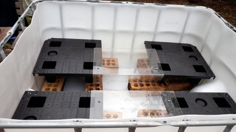 What we agreed was to only use four ‘water ups, one in each corner, and then put some bricks into the bottom of the IBC and place the water ups on top of them, thus adding roughly ten more centimetres of depth to the reservoir in the bottom. To form the rest of the barrier between the growing medium and the water, we found some Perspex document holders (previously liberated from a dump pile outside someone’s house) and cut them up using an angle grinder to form a number of flat sheets.