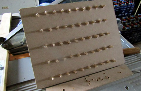 I drilled 50 7/32” holes (sorry, I have had my drills for many years and they are pre-metric) into the MDF board at designated places. Drilling 7/32”holes for the 6mm dowels gave me a firm enough fit that they would stay in place without glue, but not so tight that they couldn’t be tapped in with a hammer. I have a bench drill and used that so that the holes were as close to 90° to the surface of the board as I could get them, pretty much. The new deal actually worked out better than my original idea of gluing the dowels into the holes, because it meant that the length of the dowel (and hence the depth of the planting hole) was adjustable.