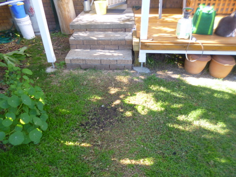 To get around this I proposed to Linda about digging down a bit and putting some gravel in so that the water would not overflow, but soak in and not be lost. With typical commonsense she suggested extending the soak area at each end and widening it so we could also use it as a path from the back step to the door of the garage. So it became a multipurpose path, which works for me!