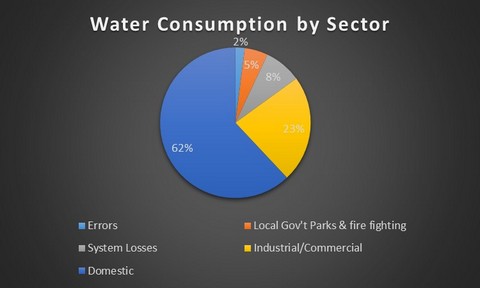 Australia is a drought country and if the predictions of what is going to happen due to climate change are true, the position is likely to become worse rather than better. Australian households consume roughly 60% of the water captured, purified and then pumped to our cities us as part of our reticulated water system (See graph below). The average Australian uses 180 to 200 litres of water per day directly and this water is provided at an energy cost of 164 kilowatthours per person per year in Australia.