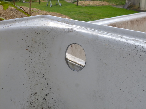 Cutting through the side of the bath was a pretty noisy and hard job. It requires you to keep pressure on and some water going over the cut for lubrication for up to 10 minutes. I was using a battery drill and it was about as happy with me by the end as the neighbours were with the noise. I would use a 240v drill next time I think. The hole needed to be such that the bottom was 50mm to 75mm below the estimated level of the gravel. This was to ensure that there would be no standing water at the surface of the gravel and so no issues with mozzies.