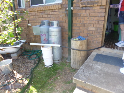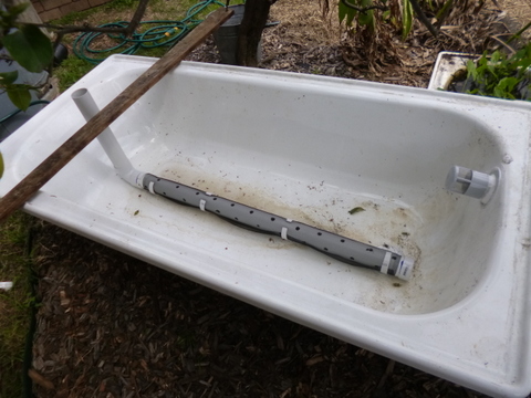 The next morning I attached some 25mm flexible tube onto the 25mm barbed fitting and ran it out the back door and into the input pipe of the first bathtub. Unfortunately the 25mm flexible tube is flexible (funny that!) so it goes well around corners but is not self-supporting, any greywater in it would cause it to sag dramatically. To get around this I ran it through a spare one metres section of 50mm pipe supported on a couple of buckets and it did the job fairly well. It is only temporary for testing purposes and I will need to develop something a little more robust for final installation. Anyway the test went perfectly, no leaks anywhere. I am somewhat impatient (alright I am very impatient!) so I put the washing machine on and allowed one load of wash water to go through the system and again it performed flawlessly.