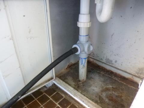 To fit the valve I cut the drain pipe leading out of the bottom of the sink about 220mm up from the floor using a crosscut wood saw (which made short work of it!). I unscrewed the S-bend and upper part of the pipe from the bottom of the sink and then cut off about 100mm from the free end of the pipe I had taken out. I then reassembled everything with the valve in place, just to make sure everything fitted where it should. It did! So I used the blue plumbers glue and put everything back in place and re-screwed the s-bend back onto the bottom of the sink. I also glued the other 50mm to 25mm barbed reducer into the horizontal outlet of the valve. I then left everything in place and did not use the sink for 24 hours to allow the glue to set.